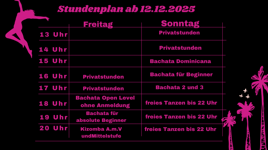 Termine für Neueinsteiger sind : Freitag der 02.01.2026 um 18 Uhr Bachata Open Level keine Anmeldung erforderlich